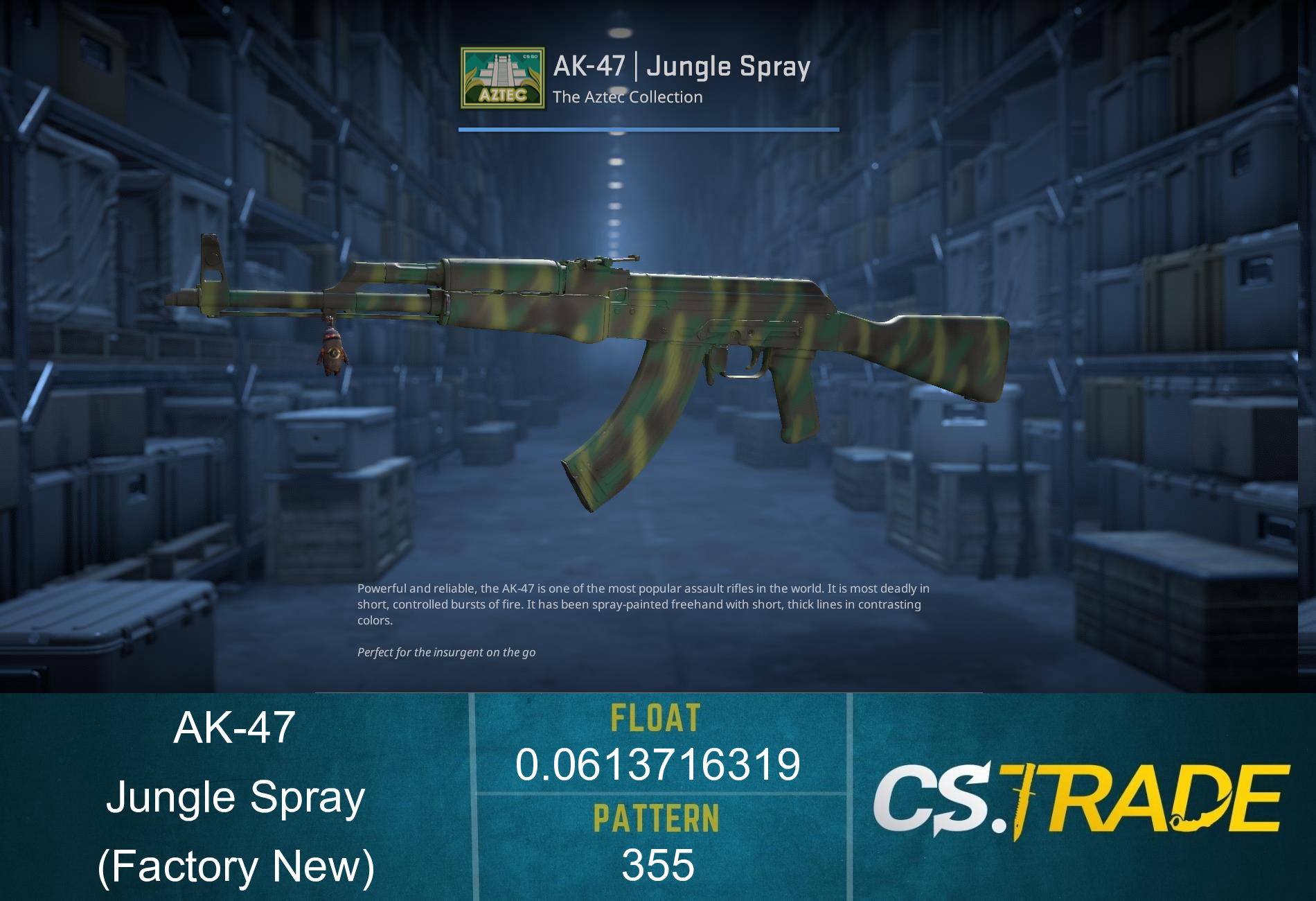 AK-47 | Jungle Spray finish style is Spray-Paint with finish catalog equal to 122. It's unique flavor text is: 'Perfect for the insurgent on the go'.