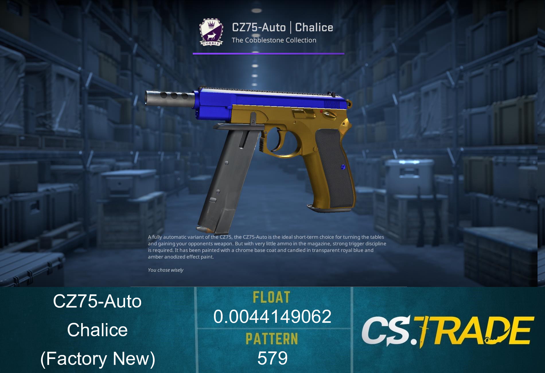 CZ75-Auto | Chalice finish style is Anodized Multicolored with finish catalog equal to 325. It's unique flavor text is: 'You chose wisely'.