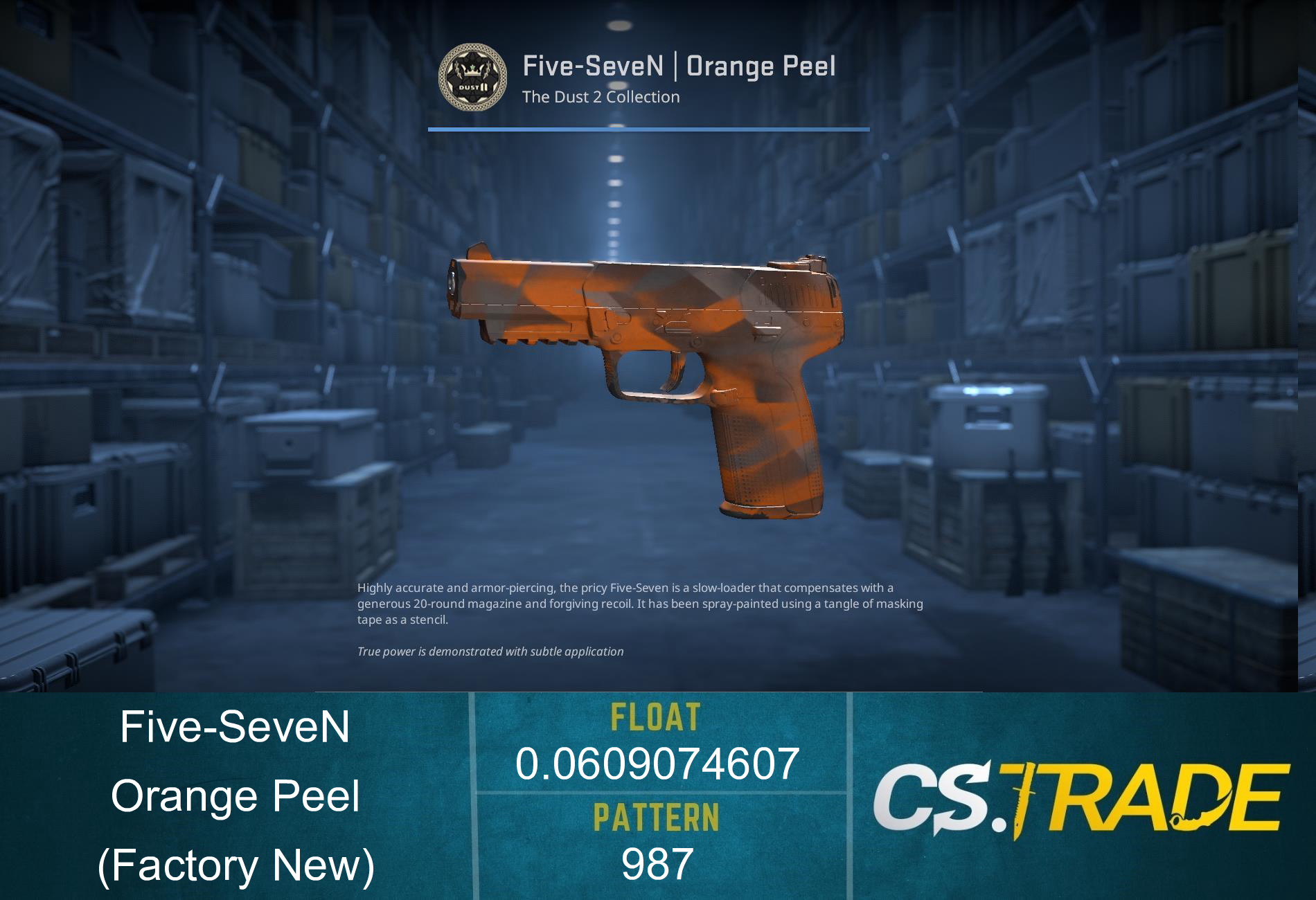 Five-SeveN | Orange Peel is an item of average liquidity. It may take some time to sell or trade it. Traders rates this skin at 3.11/5.0.
