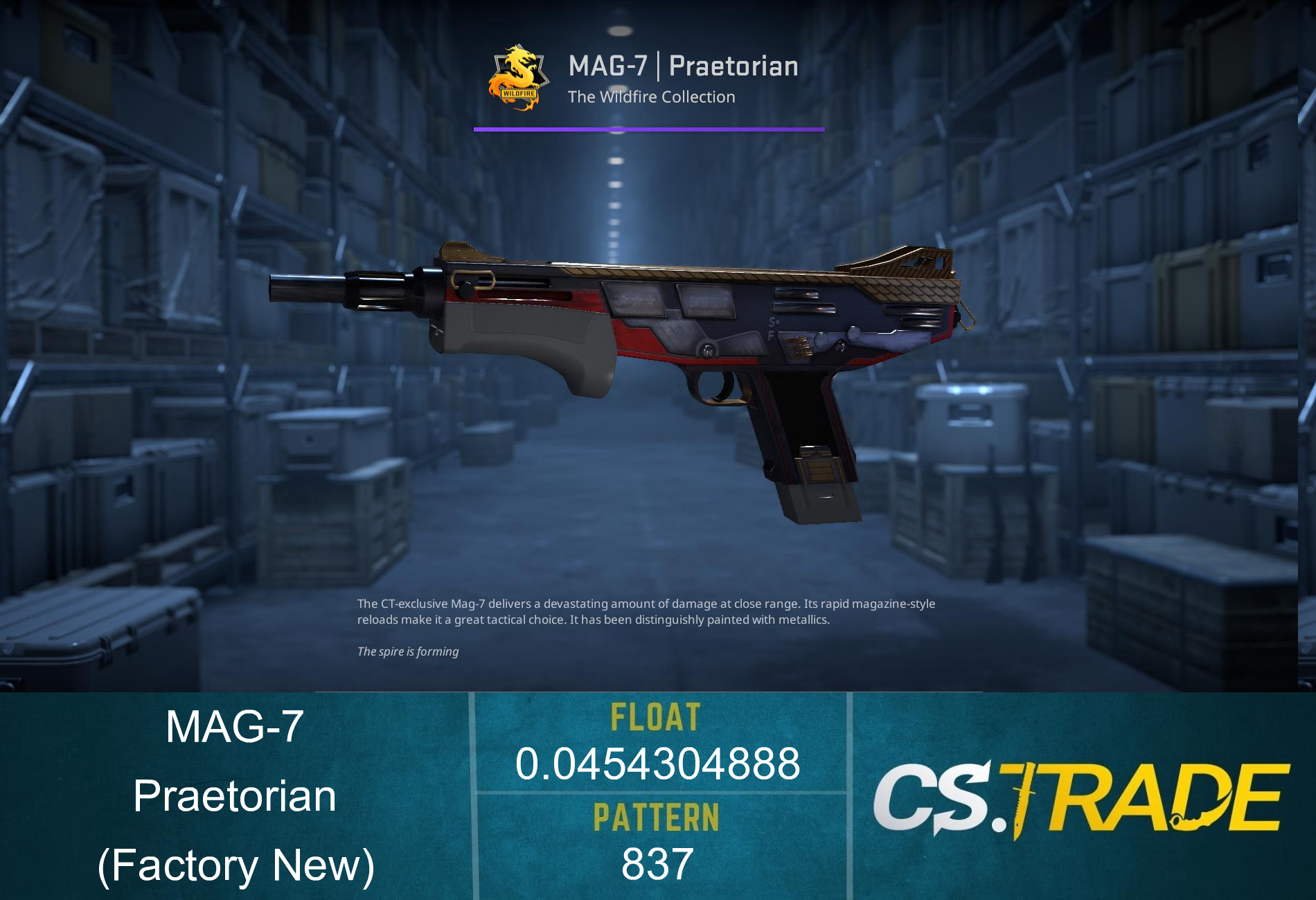 MAG-7 | Praetorian skin float value ranges from 0.00 to 0.45 which makes it available in the following wear conditions: Factory New, Minimal Wear, Field-Tested, Well-Worn, Battle-Scarred.