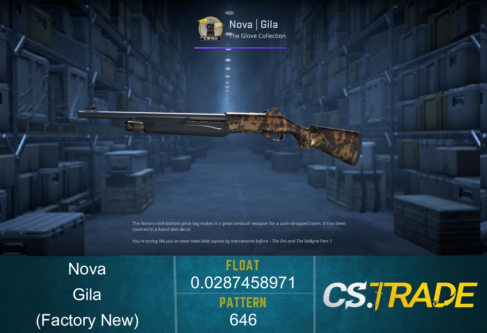 Nova | Gila is an item of average liquidity. It may take some time to sell or trade it. Traders rates this skin at 3.12/5.0.