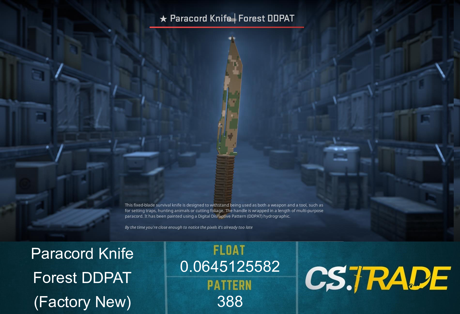 Paracord Knife | Forest DDPAT is an item of very low liquidity. It's hard to sell or trade. Traders rates this skin at 3.80/5.0.