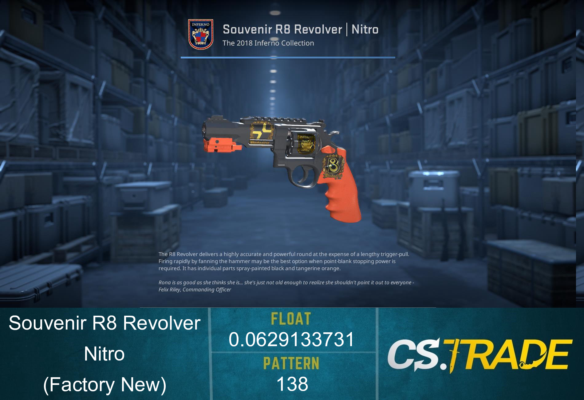 R8 Revolver | Nitro skin float value ranges from 0.06 to 0.80 which makes it available in the following wear conditions: Factory New, Minimal Wear, Field-Tested, Well-Worn, Battle-Scarred.
