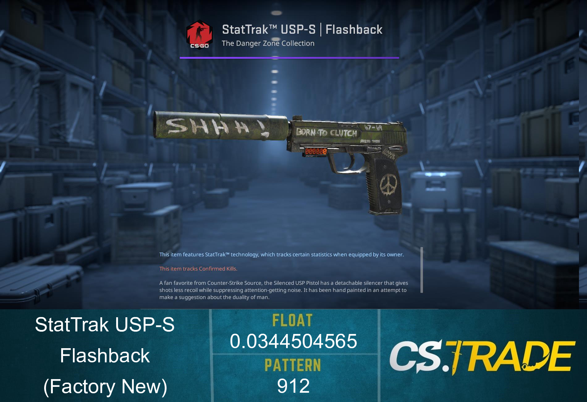 USP-S | Flashback finish style is Custom Paint Job with finish catalog equal to 817. It's unique flavor text is: 'Sierra Hotel Hotel Hotel'.